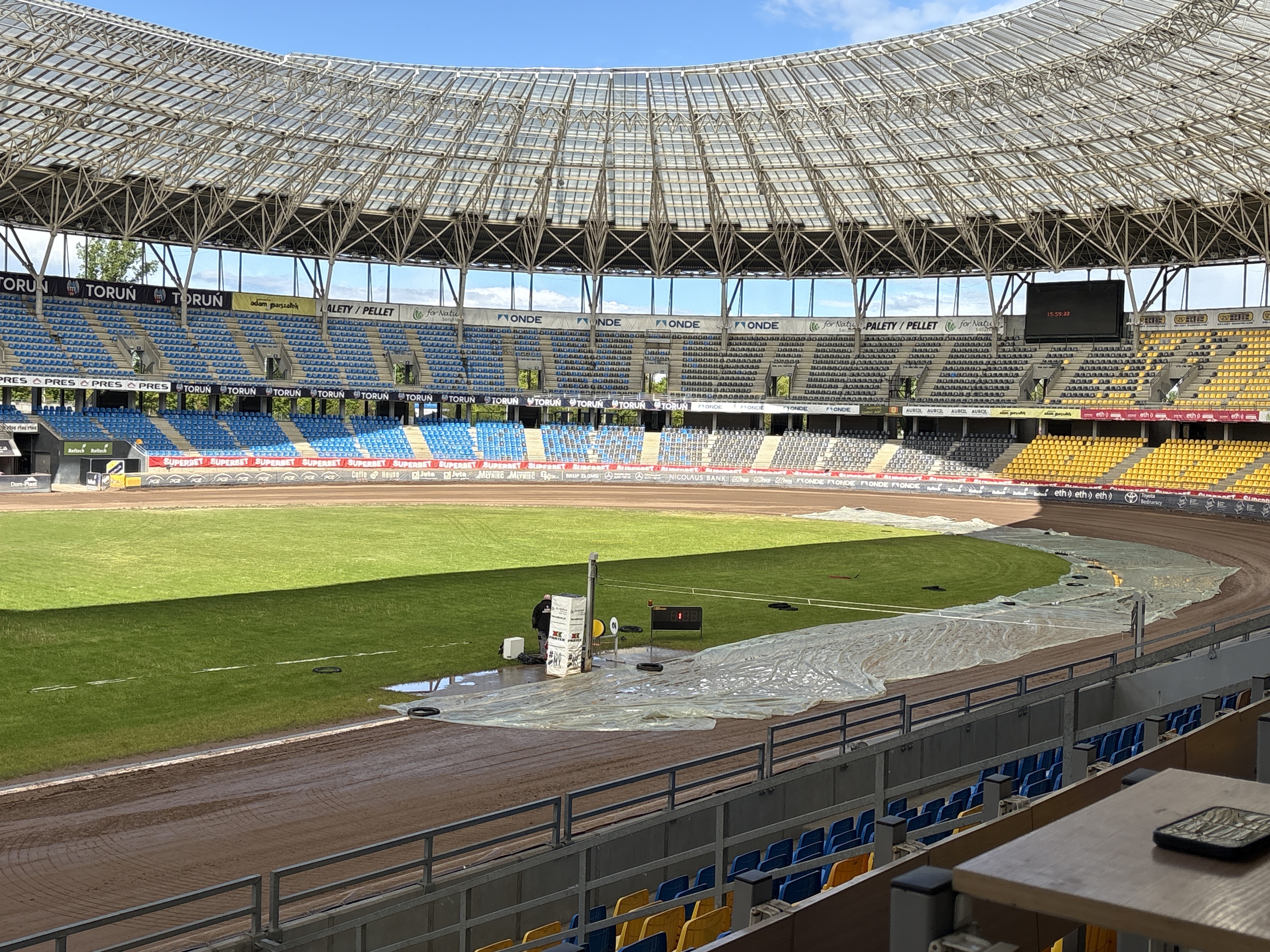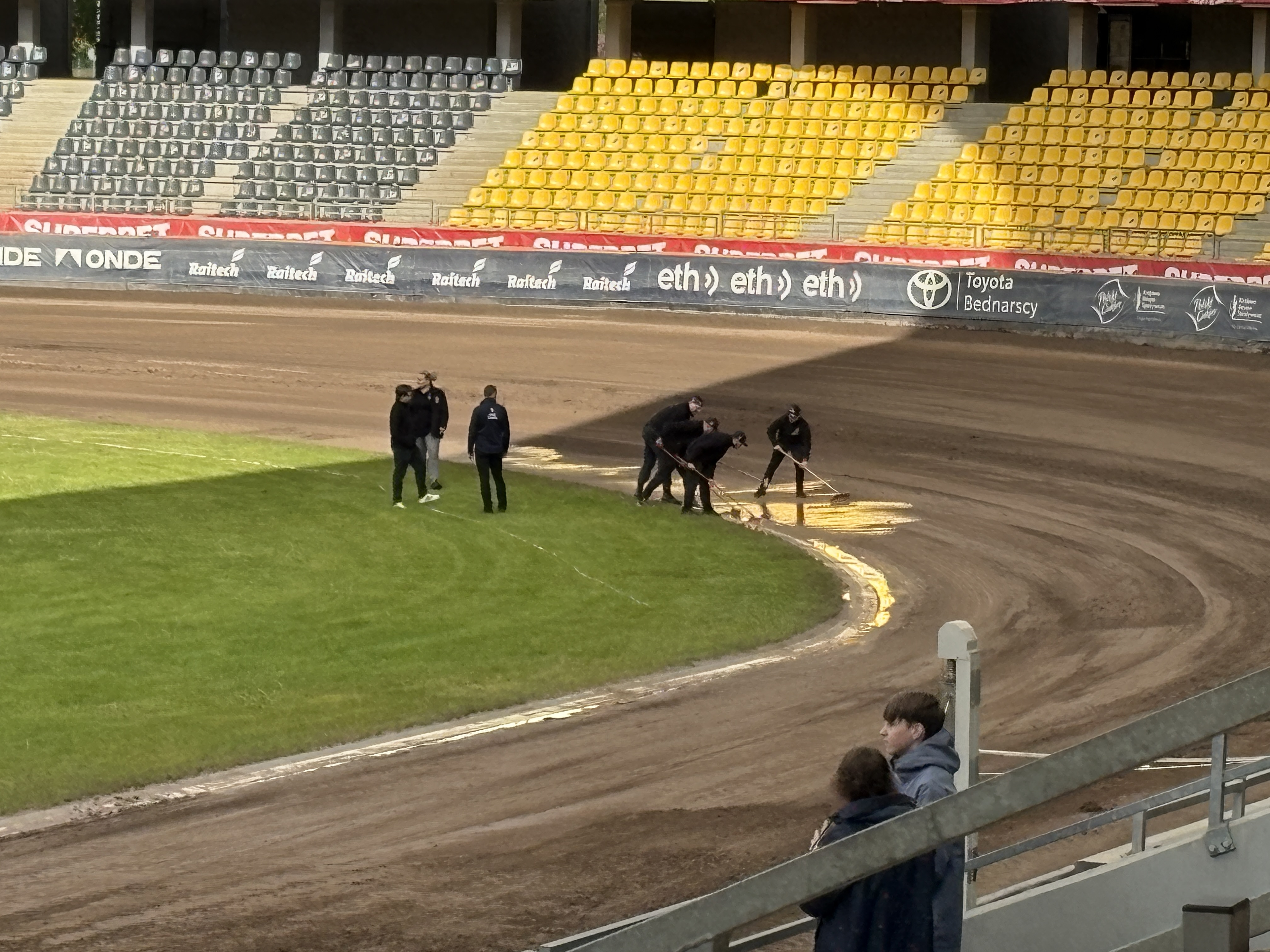 Nad stadionem ponownie pada rzęsisty deszcz.