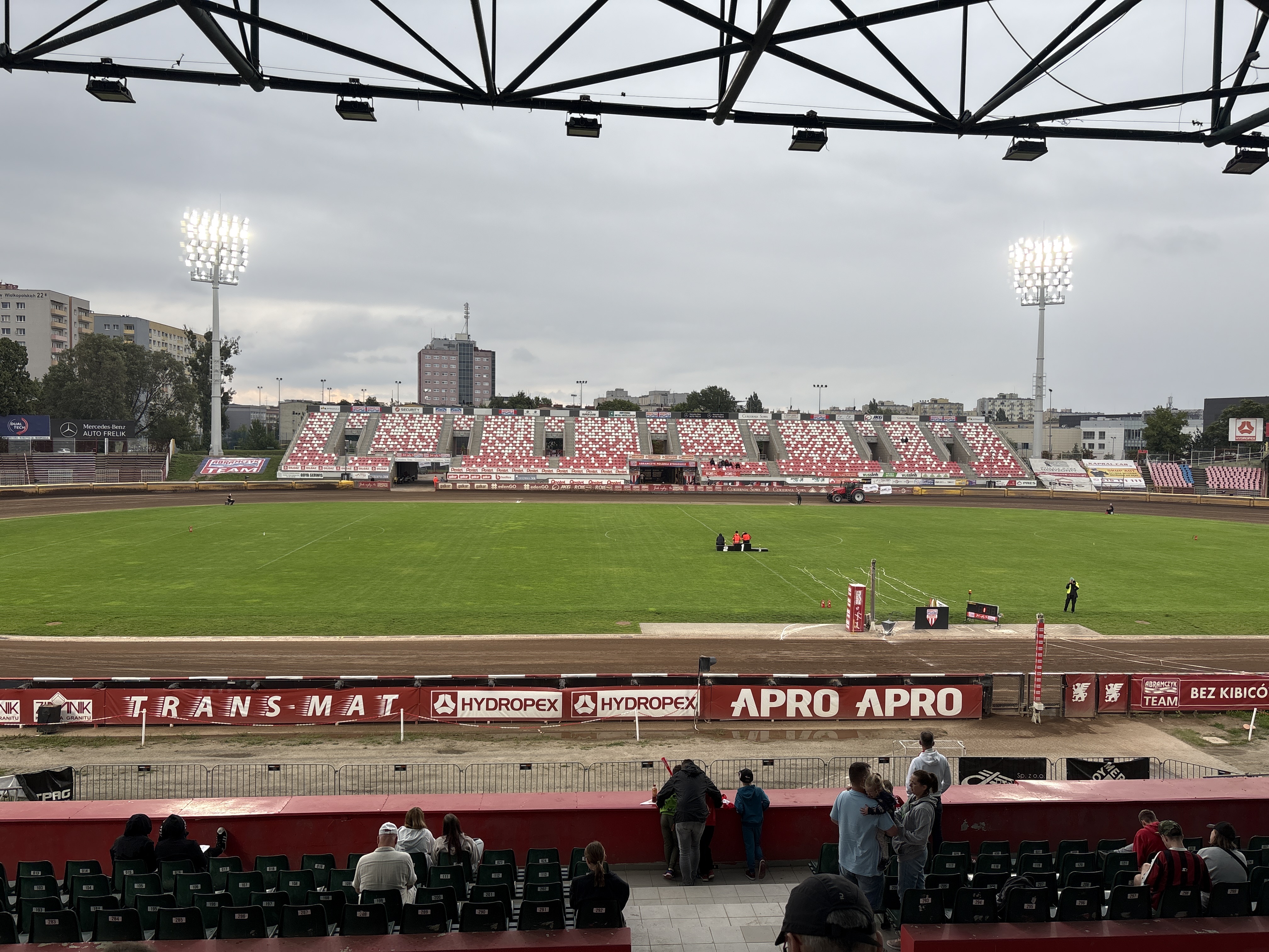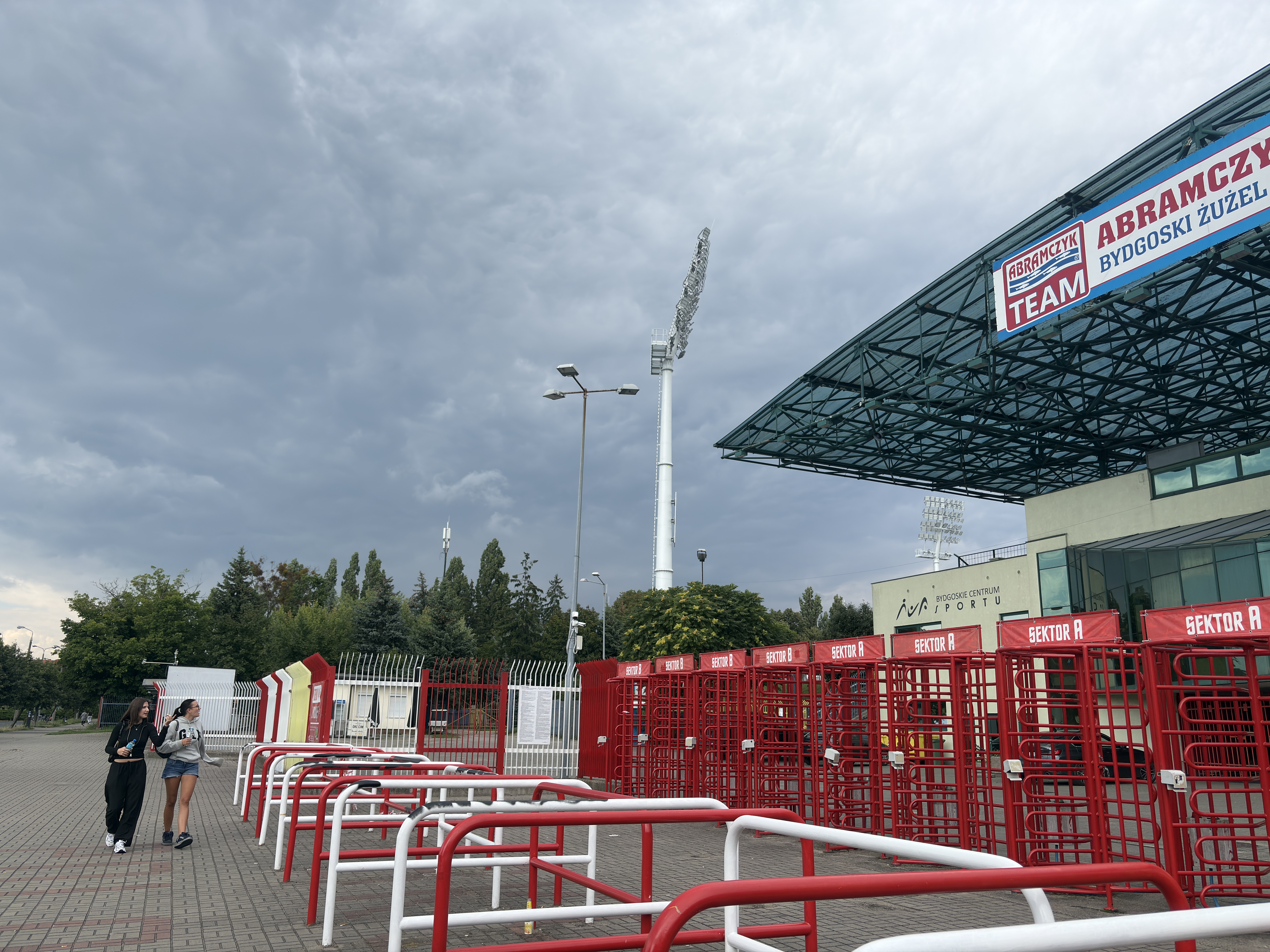 Nad stadion bydgoskiej Polonii nadciągają ciemne chmury. Aktualnie jednak deszcz nie pada. Fot. Dariusz Jagła