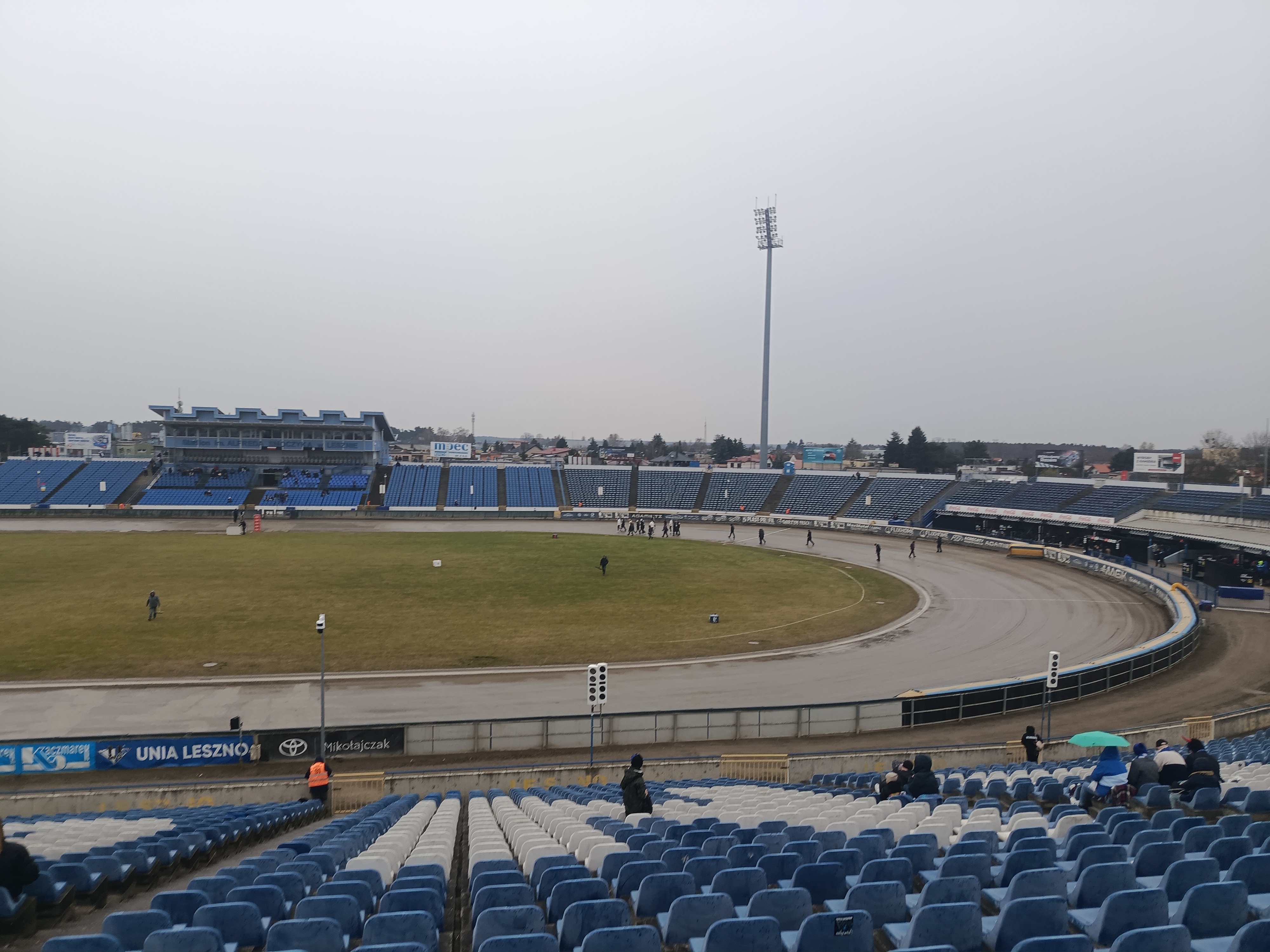 Nadchodzące wyścigiW Lesznie od mniej więcej godziny trwają opady deszczu. Zawodnicy gości wyruszyli na obchód toru, by zweryfikować czy uda się w bezpiecznych warunkach rozegrać dzisiejszy mecz.