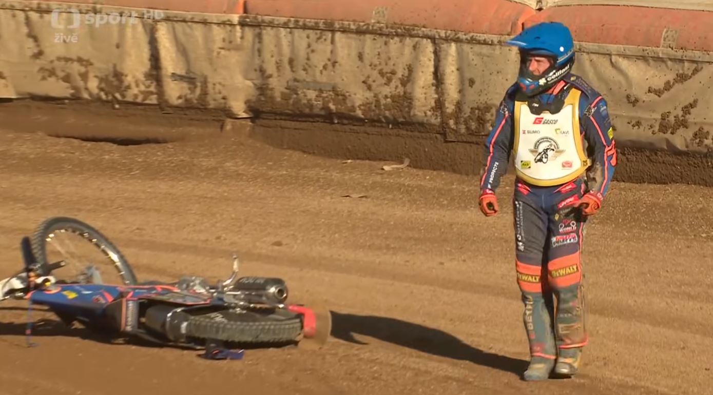 Łotysz prowadził w pewnym momencie o pół prostej, co dawało mu spokojne prowadzenie. Jednakże w finale prestiżowego turnieju, zawodnicy mają do przejechania sześć okrążeń. Opony żużlowe docierają wówczas na skraj wytrzymałości, o czym przekonał się Andrzej Lebiediew. Tuż przed linią mety, tylna opona nie wytrzymała i pękła. Dimitri Bergé to wykorzystał, wyprzedzając rywala i wygrał 77. Zlatá Přilba. Były żużlowiec Lokomotivu Daugavpils nie wytrzymał. Dobitnie pokazał swoją frustracje, kopiąc motocykl i zarazem go wywracając. Dodatkowo cisnął on z impetem kaskiem o nawierzchnie toru, po czym rzucił go nieodpowiedzialnie w trybuny. Sportowa złość jest jak najbardziej zrozumiała, tym bardziej przy tak pewnym prowadzeniu. Kamery CT Sport, realizatora transmisji, zarejestrowały całe zajście. Filmik wstawiamy poniżej.