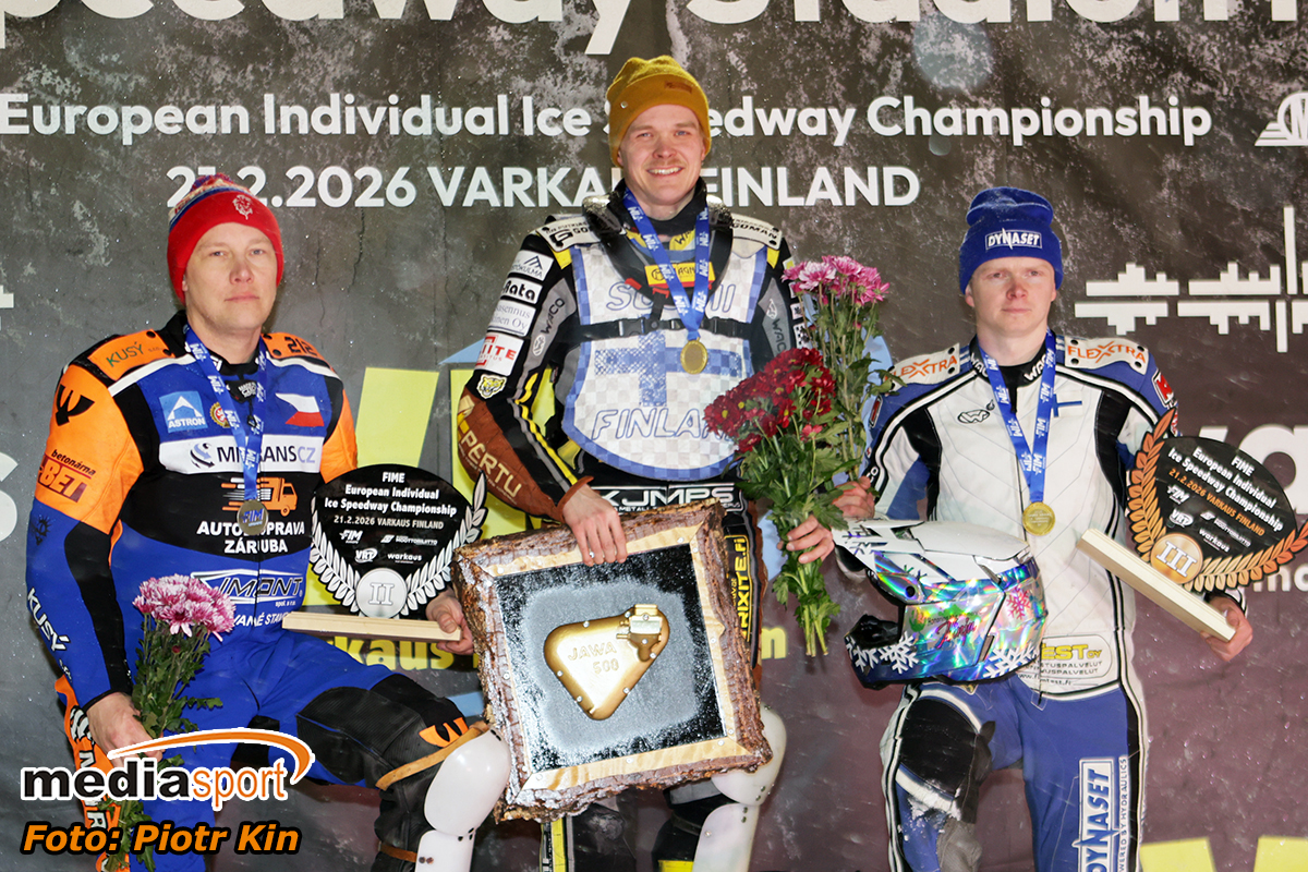 Podium Indywidualnych Mistrzostw Europy w ice speedway’u w Varkaus. Od lewej: Lukas Hutla, Heikki Huusko, Max Koivula