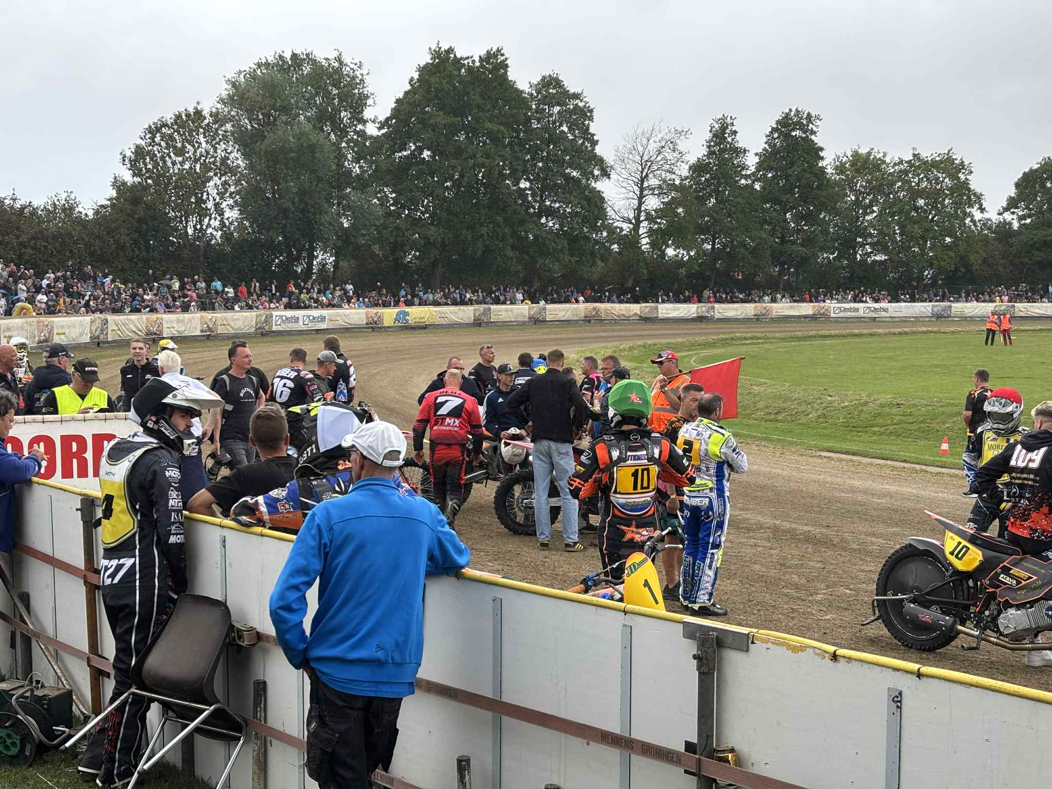 To oczywiście nie spodobało się shorttrakowcom, którzy głośno protestowali przeciwko takiej decyzji. Do niespotykanej sytuacji doszło przed wyścigiem nr 7. Wówczas, gdy brama do parkingu była już zamykana, zdenerwowani zawodnicy postanowili siłą wyjechać na tor, po czym udać się na murawę i pozostawić tam swoje motocykle. To spowodowało przerwanie zawodów na kilkadziesiąt minut.